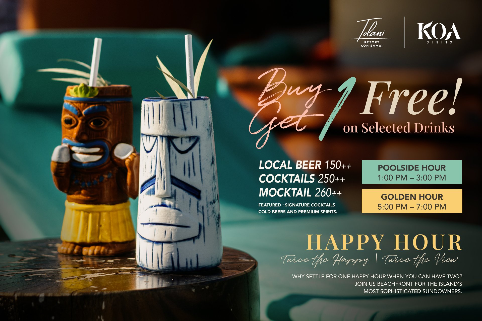 Elevate your day by the sea with Happy Hour at Tolani Resort Koh Samui an inviting beachfront experience crafted for relaxed afternoons and golden sunset moments. Enjoy our exclusive Buy 1 Get 1 Free offer on selected drinks while unwinding with ocean views and the soothing island breeze at the Beach Bar.